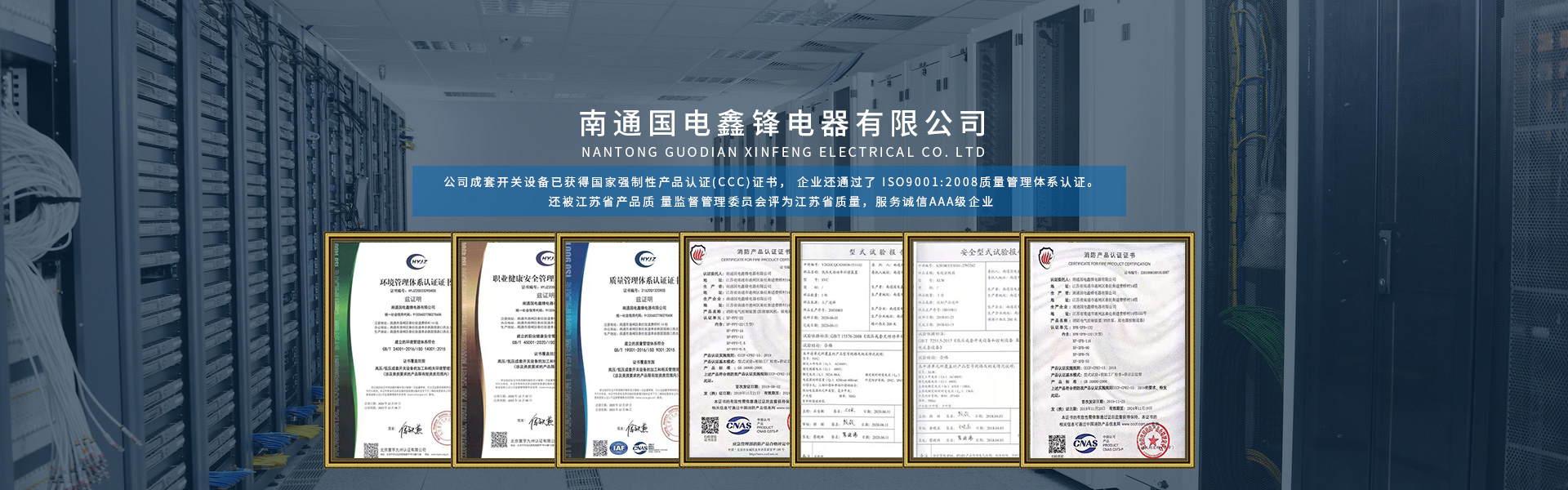 南通國電鑫鋒電器有限公司座落在有中國江蘇省南通市,南通是全國首批十四個沿海對外開放城市之一,是我國 民族紡織工業(yè)的搖籃和長江沿線的港口城市,又是中國的體育之鄉(xiāng), 教育之鄉(xiāng)崛起中的南通是江海大地上一顆璀燦的明珠。 公司成立于2005年,是專業(yè)生產(chǎn)各類高低壓成套開關設備的專業(yè)廠家,公司成套開關設備已獲得國家強制性產(chǎn)品認證(CCC)證書, 企業(yè)還通過了 ISO9001:2008質(zhì)量管理體系認證。